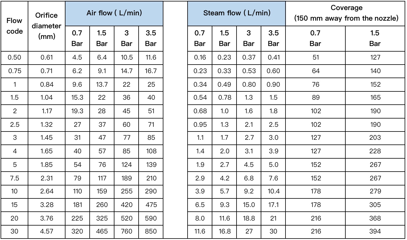 Technical data of Spraying Air or Steam: