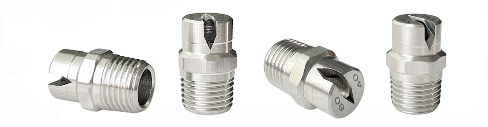 • Standard angle flat fan spraying. • Thread size from 1/8″ to 2″. • High quality stainless steel material. • Spray angles from 0 degree to 110 degree. • Droplet size from small- to medium to large. • Flat spray pattern distributes the liquid as a flat- or sheet-type spray. • Uniform distribution over a wide range of flow rates and pressures. • Unobstructed flow passages minimize clogging.  • Specially tapered spray pattern is ideal for use in manifold and header applications.