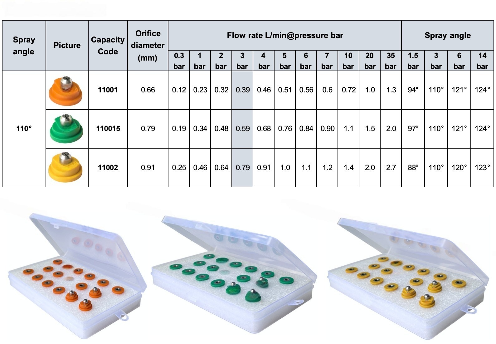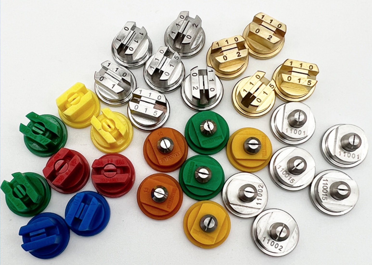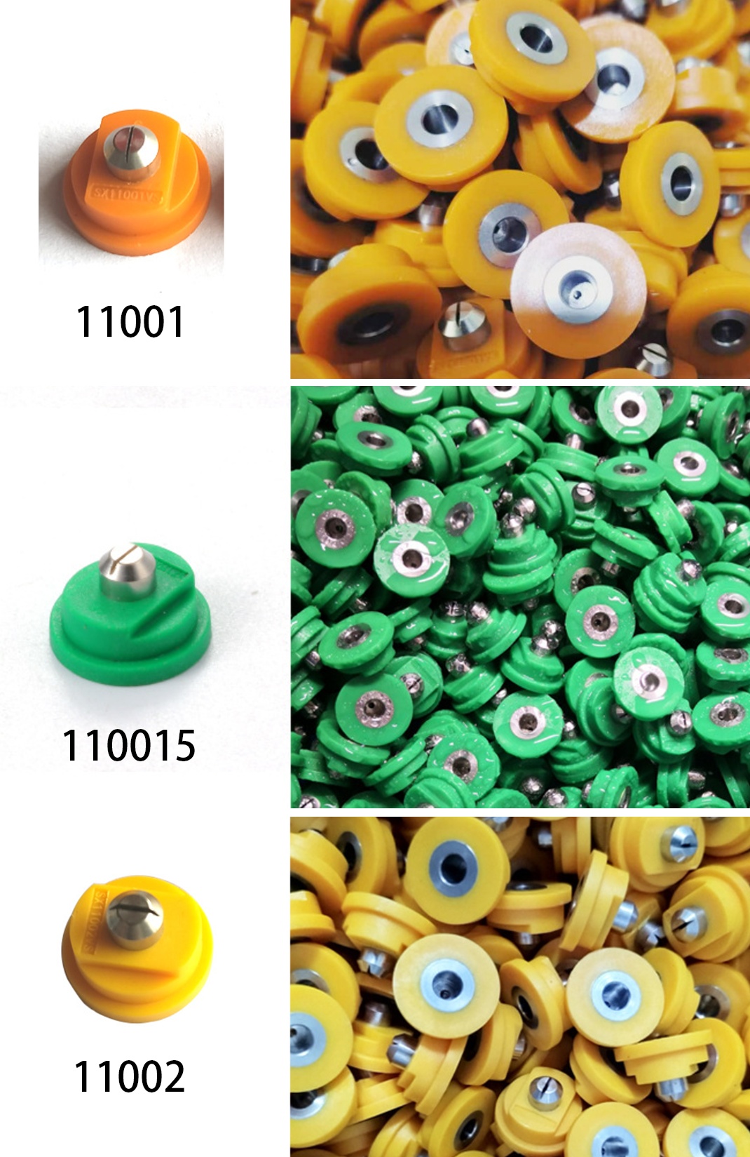 • Standard angle flat fan spraying. • Quick release size: 14.8mm • High quality stainless steel material. • Spray angle is 110 degree. • Code have 11001, 11015, 11002. • Droplet size is very smaller. • Flat spray pattern distributes the liquid as a flat- or sheet-type spray.