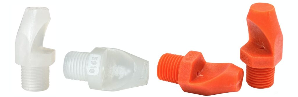 • Narrow angle flat fan spraying. • Thread size from 1/4″. • Plastic material. • Spray angles 50 degree. • Droplet size medium.