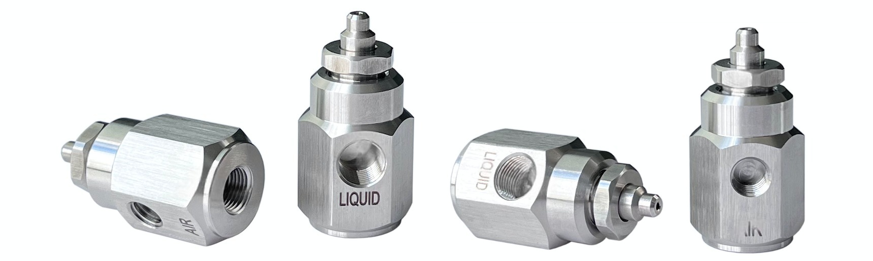 ● Working temperature: 0-100℃ ● Air pressure: 0.2-0.8MPA ● Liquid pressure: 0-0.8MPA ● Medium: water, oil ● Spray angle: flat fan or round atomizing spraying ● Mini design, 304 stainless steel material