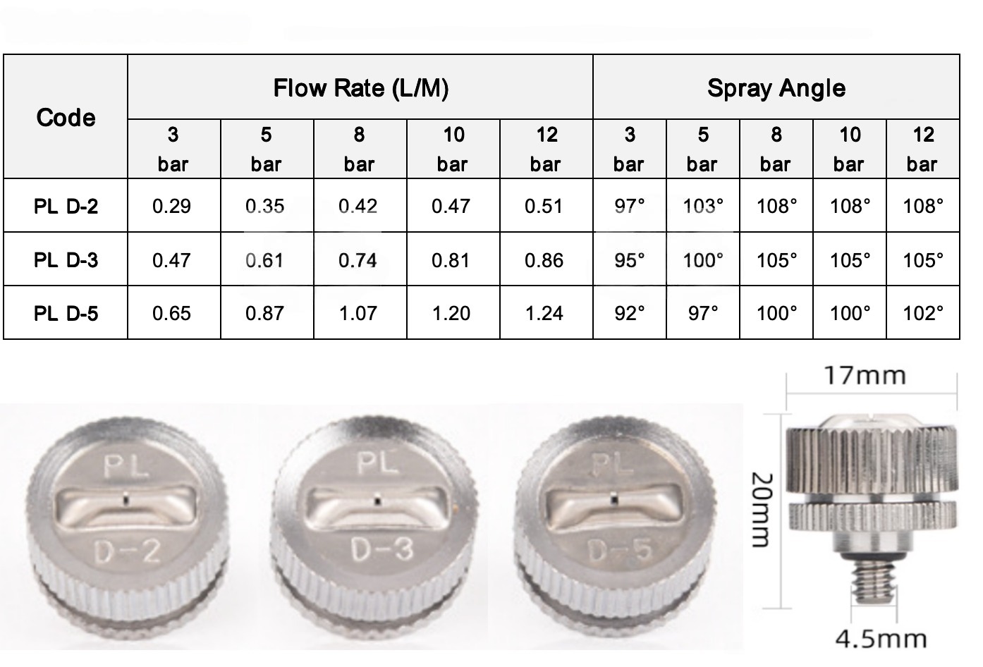 • Thread size 3/16unc or 10/24unc; • Orifice code: PL D-5, PL D-3, PL D-2, KS K-5; • Low pressure design, working pressure from 1 bar to 10 bar; • Fine mist spray nozzle is applied the low-pressure thoery, the spraying liquid could be runing water, the misting performance is excellent.