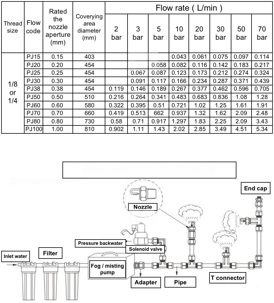 1/8″ ruby mist pin type impact 90 degree spray PJ stainless steel SS or PP cotton strainer filter high pressure micro cooling fog nozzle