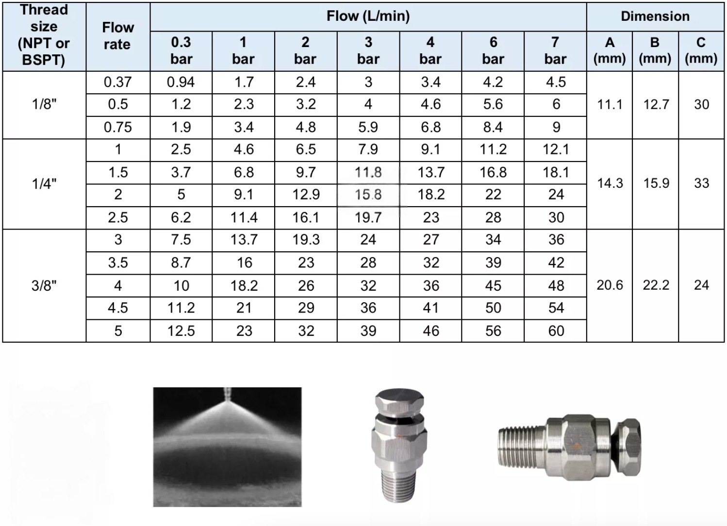 ● Thread size: 1/8″, 1/4″, 3/8″, 1/2″, Male
