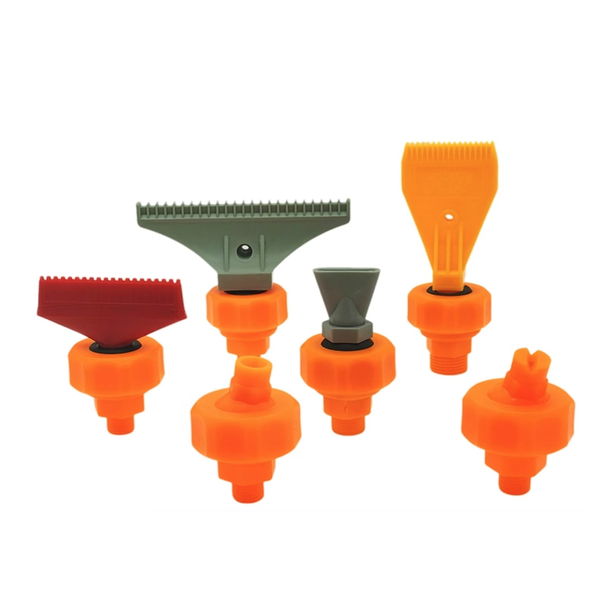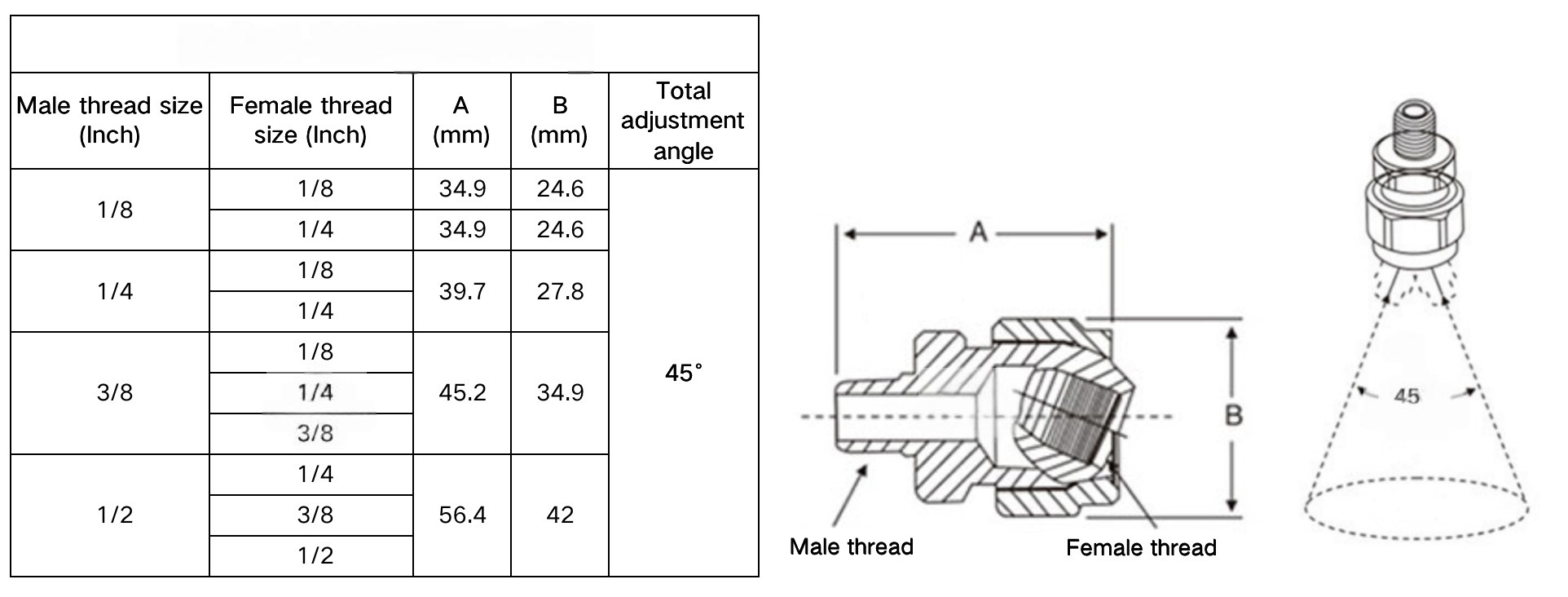 Adjustable nozzle installation angle and spray position, adjustable range of 45°, adjustable ball joint with precision machined surface to ensure sealing and prevent leakage, can withstand pressure of 21 bar, inlet connection size 1 /8″, 1/4″, 3/8″, and 1/2″.