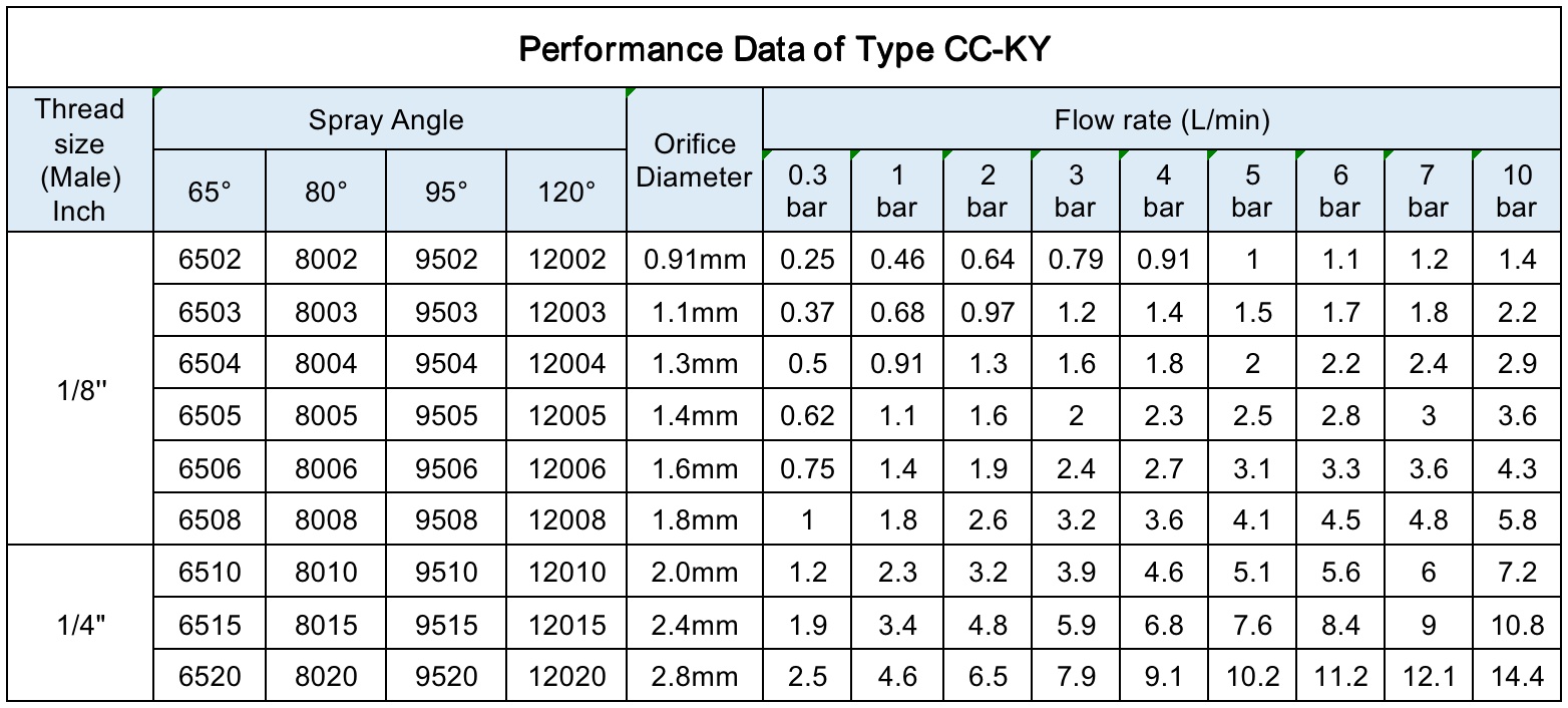 Flat fan spraying: CCKY-1/8PVDF 6504; CCKY-1/8PVDF 9503; CCKY-1/8PVDF 9504; CCKY-1/8PVDF 9506; CCKY-1/8PVDF 10001; CCKY-1/4PVDF 6510; CCKY-1/4PVDF 9510; CCKY-1/4PVDF 10001;