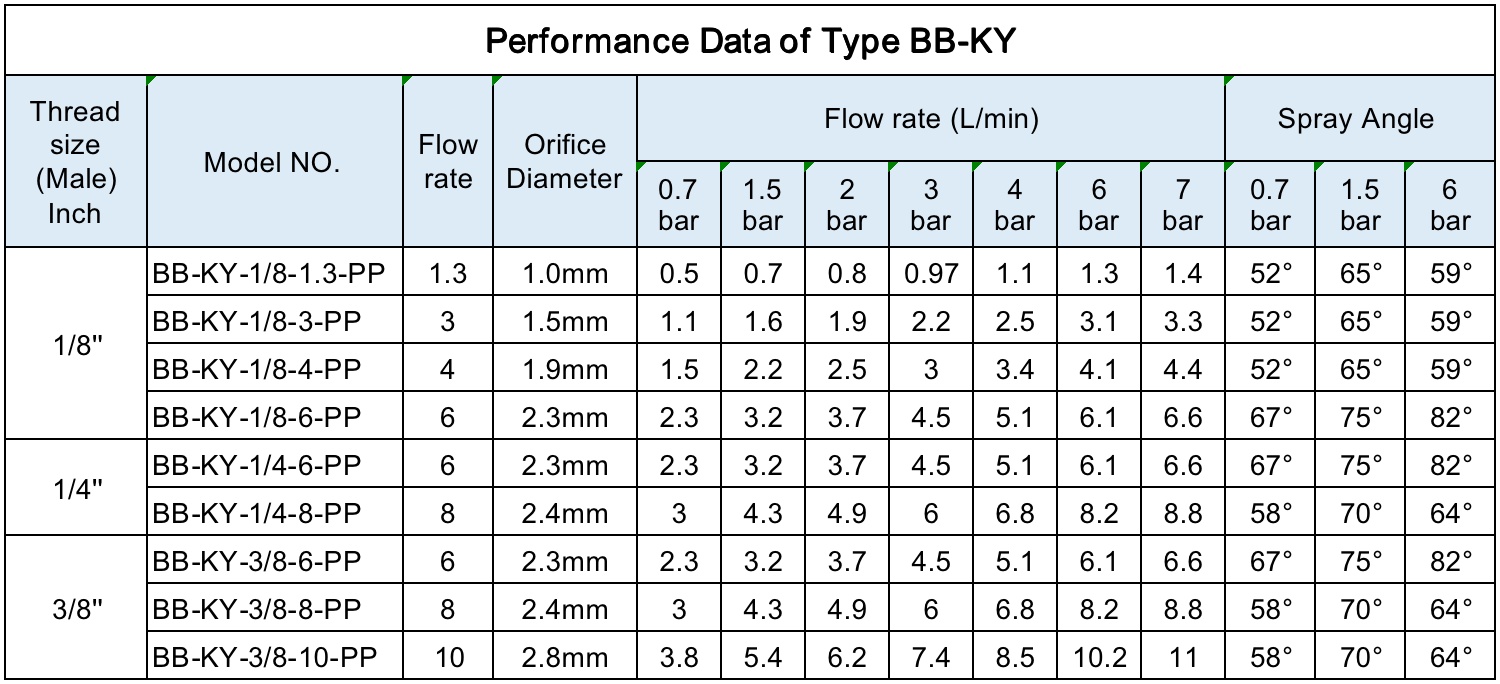 Full cone spraying: BB-KY-1/8-1.3-PVDF, BB-KY-1/8-3-PVDF, BB-KY-1/8-4-PVDF, BB-KY-1/8-6-PVDF;